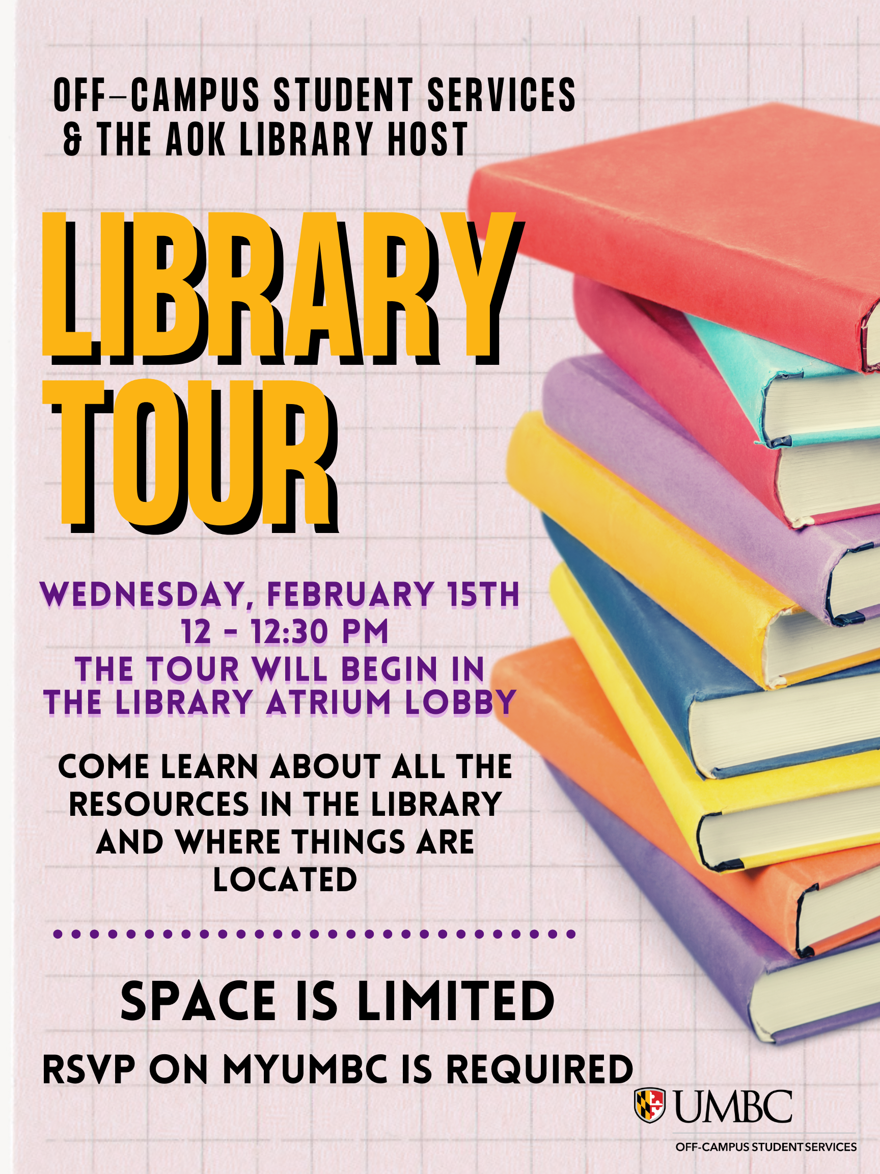 Join us for a tour of the library to learn more about all the resources inside like study rooms, quiet spaces, how to find books in the stacks, research resources and more!