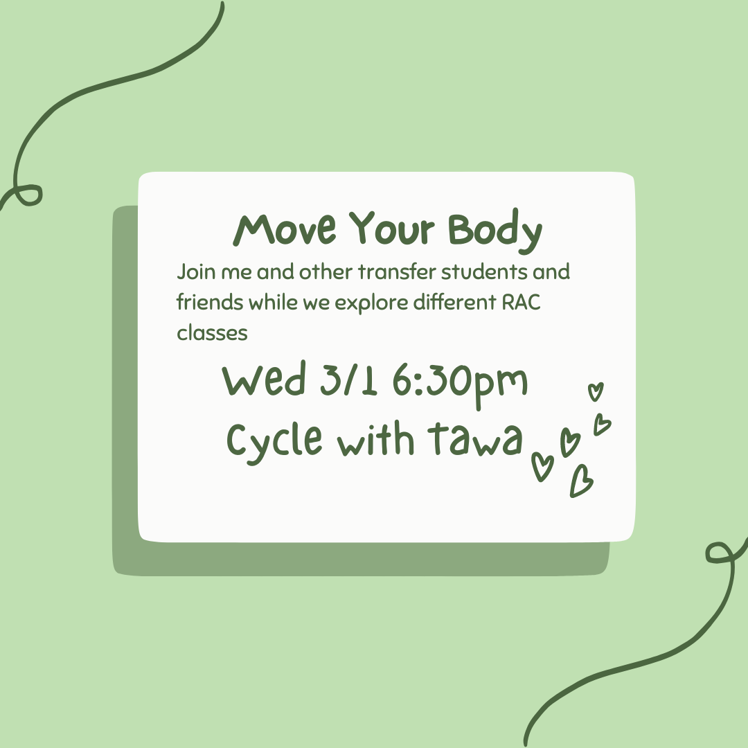 Join me and transfer students and friends as we explore new RAC classes weekly. This week we are joining instructor Tawa Wednesday March 1 at 6:30pm as she takes us on a cycle journey.