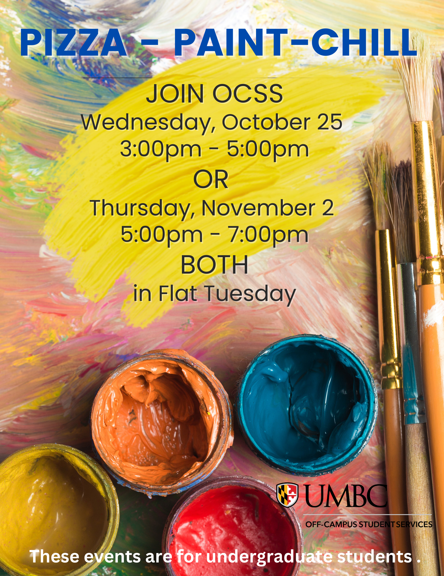 Come join OCSS for Pizza, Paint, and Chill! Come relax after class and mingle with fellow students while enjoying free pizza and painting activities. This event will be taking place 2 DAYS! Join us on Wednesday from 3-5pm OR Thursday from 5-7PM! Hope to see you all there!