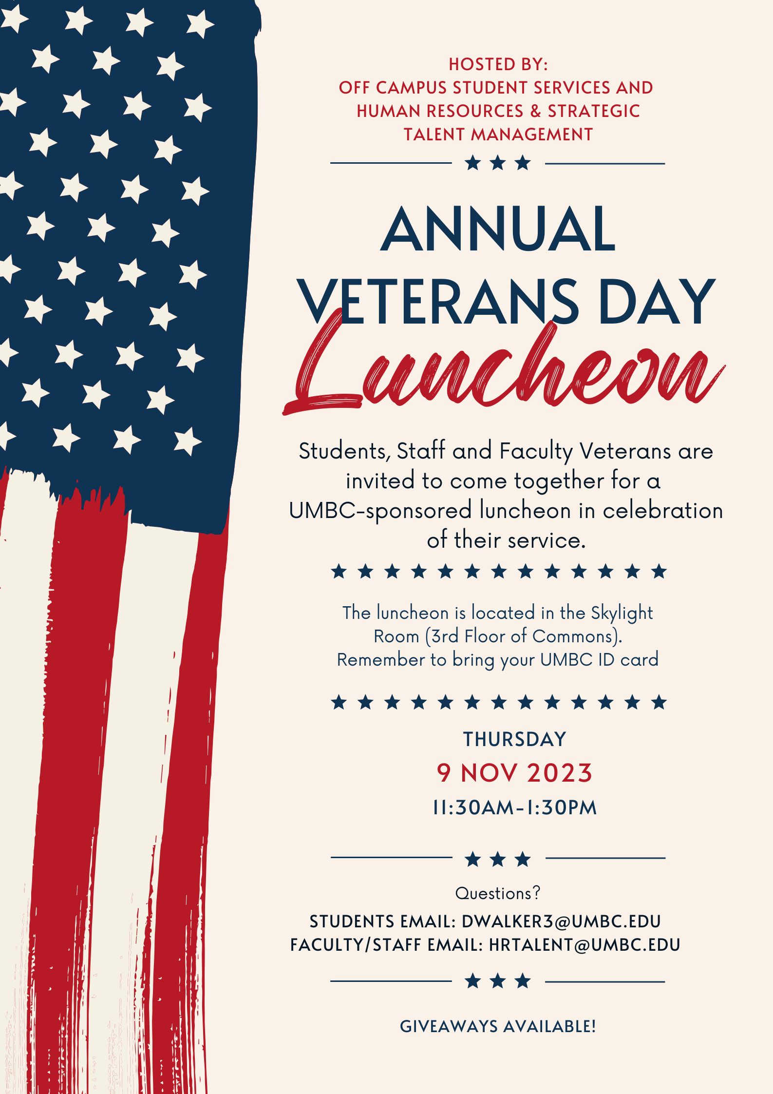 Join OCSS and HR & Strategic Talent Management in Celebrating our Veterans at our Annual Veterans Day Luncheon. Students, Staff and Faculty Veterans are invited to come together for a celebration of their service.