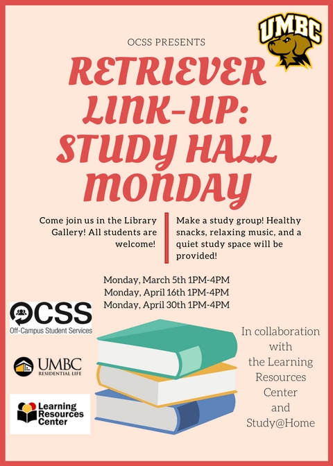 In collaboration with the LRC, Retriever Link-Up's Study Hall Monday encourages commuters, transfers, and residents to create study groups as well as provide an alternative study space on-campus for individuals. At our event, we will be providing healthy foods/snacks for you to enjoy. We will also have tutors from the Writing Center and Math Lab for your convenience.