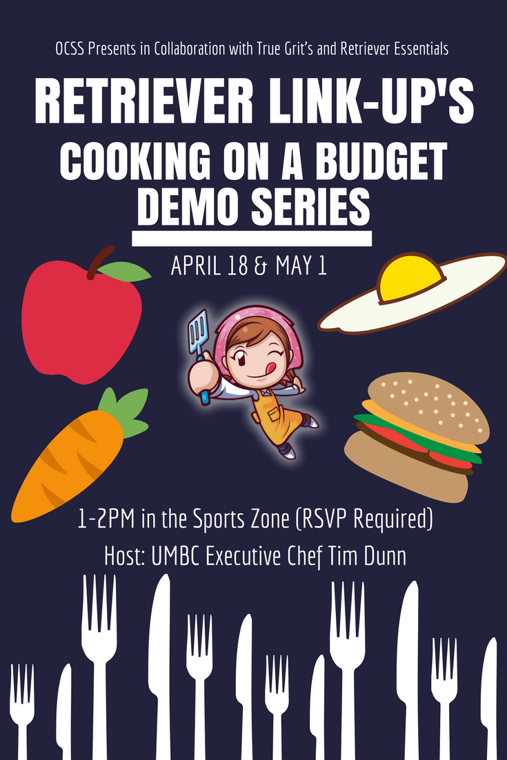 Retriever Link-Up's 'Cooking on a Budget' encourages commuter, transfer, and residential students to learn the many budget-friendly techniques used for time-efficient and healthy cooking. Attendees will learn cooking techniques, taste delicious foods, and receive UMBC dietitian-approved recipe cards. Don't miss your chance for amazing raffle giveaways and so much more!