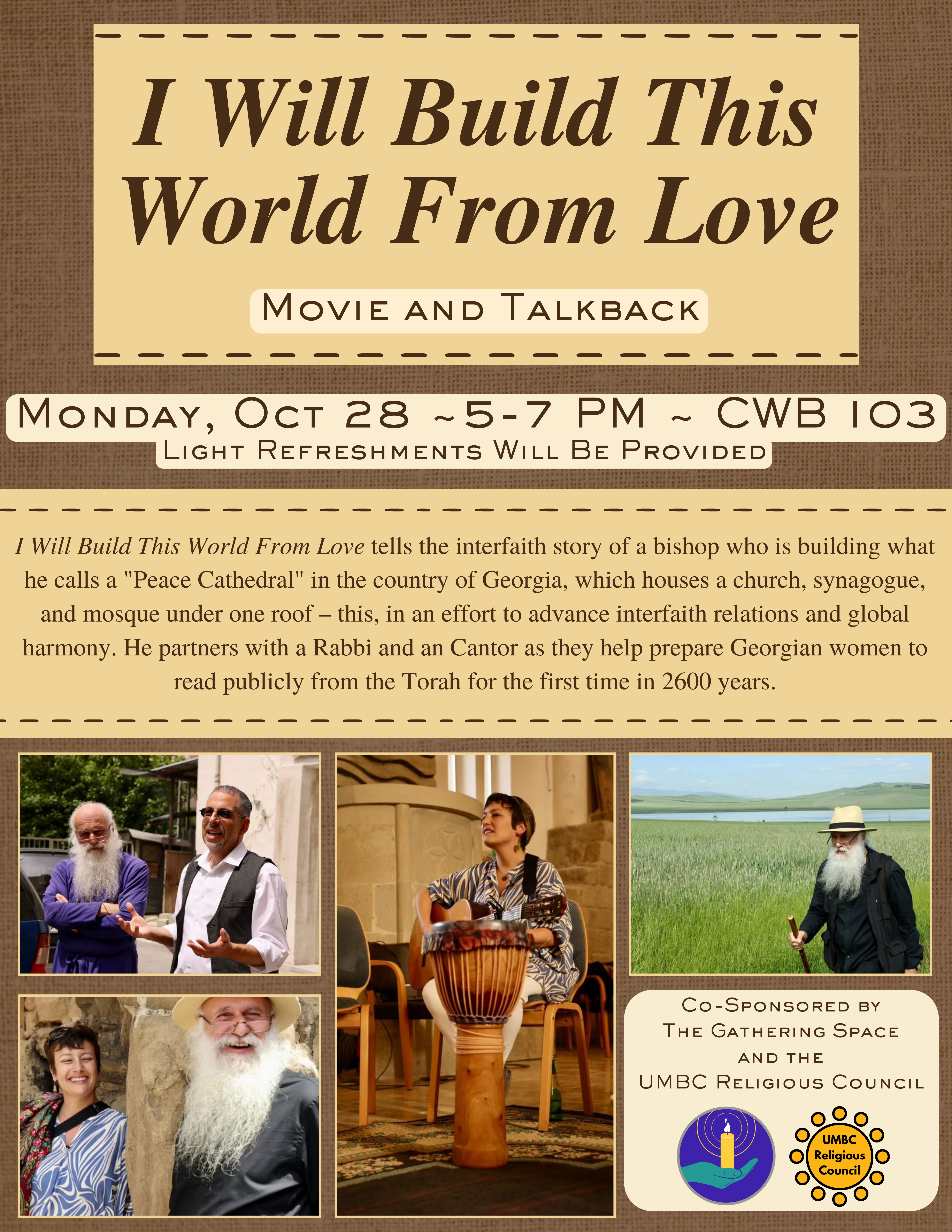 The Gathering Space and UMBC Religious Council are excited to announce that we will be co-sponsoring a screening of I Will Build This World From Love. This film depicts the efforts of a Georgian bishop as he builds an interfaith house of worship, much like how we aim to cultivate an interfaith space here on the UMBC campus! It will first be premiering at the Montclair Film Festival in New Jersey on Sunday, October 27th, but we encourage you to join us for a viewing and subsequent talk back with director John Block, Malkaz Songulashvili, Golan Ben-Chorin, and Meredith Greenberg.