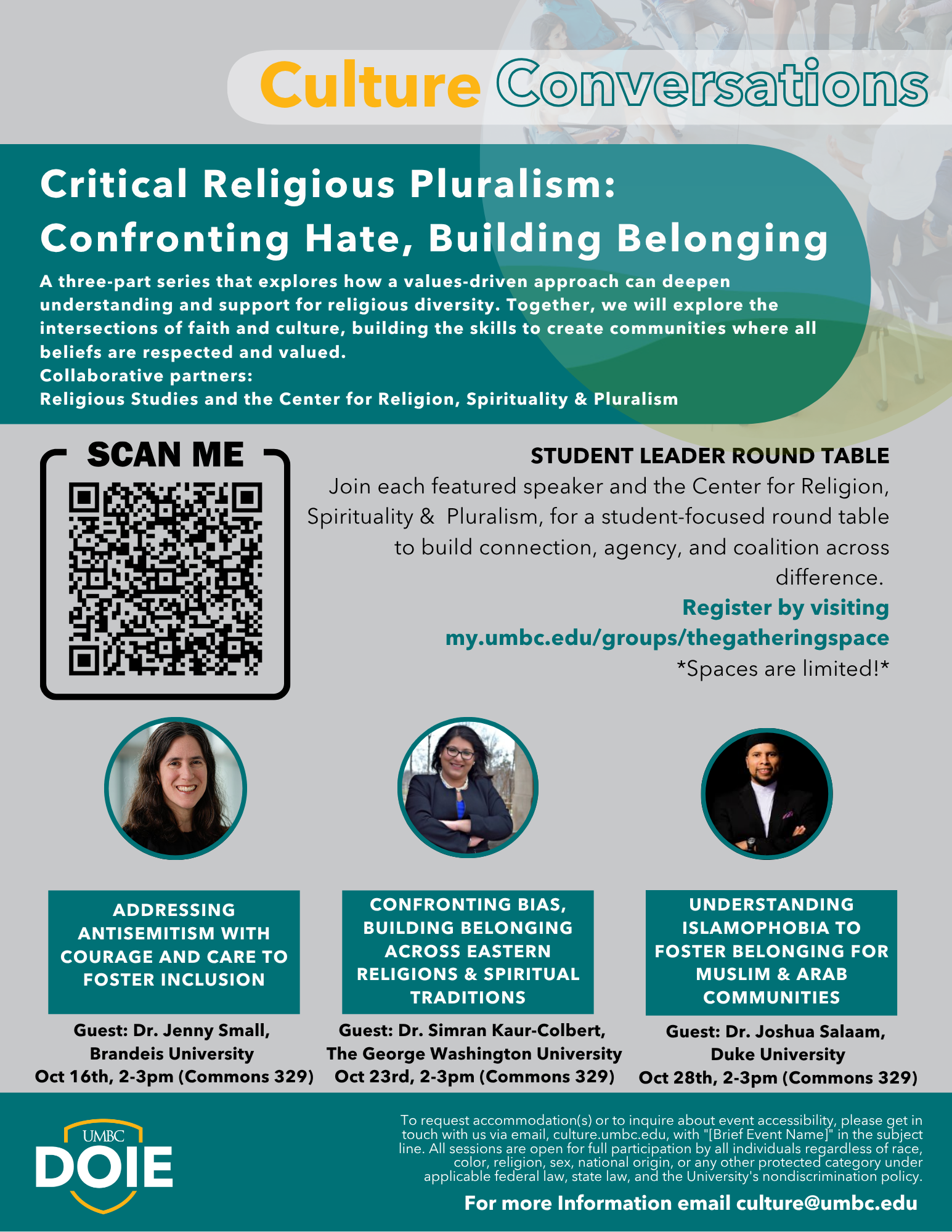 Join Dr. Jenny Small and the Center for Religion, Spirituality & Pluralism, for a student-focused round table to build connection, agency, and coalition across difference. The focus of this first session will be addressing antisemitism with courage and care to foster inclusion.