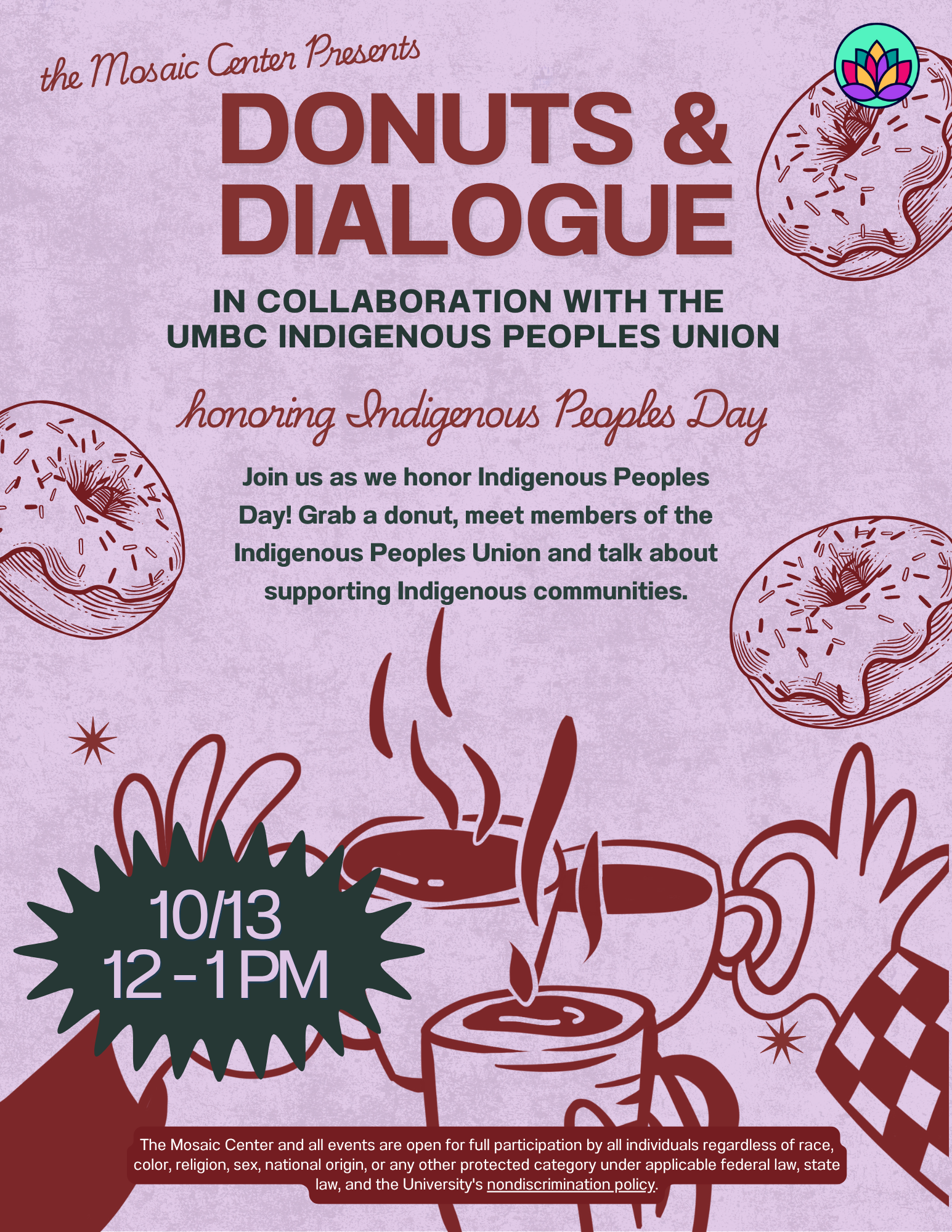 Join us in The Mosaic as we honor Indigenous Peoples Day! Grab a donut, meet members of the Indigenous Peoples Union, and chat about topics surrounding Indigenous history, myths, and misconceptions. Whether you're looking to learn more about the Indigenous Peoples Union, connect with other Indigenous students, learn more about Indigenous cultures, or just have conversation over sweet treats, stop by on Monday, October 13th!