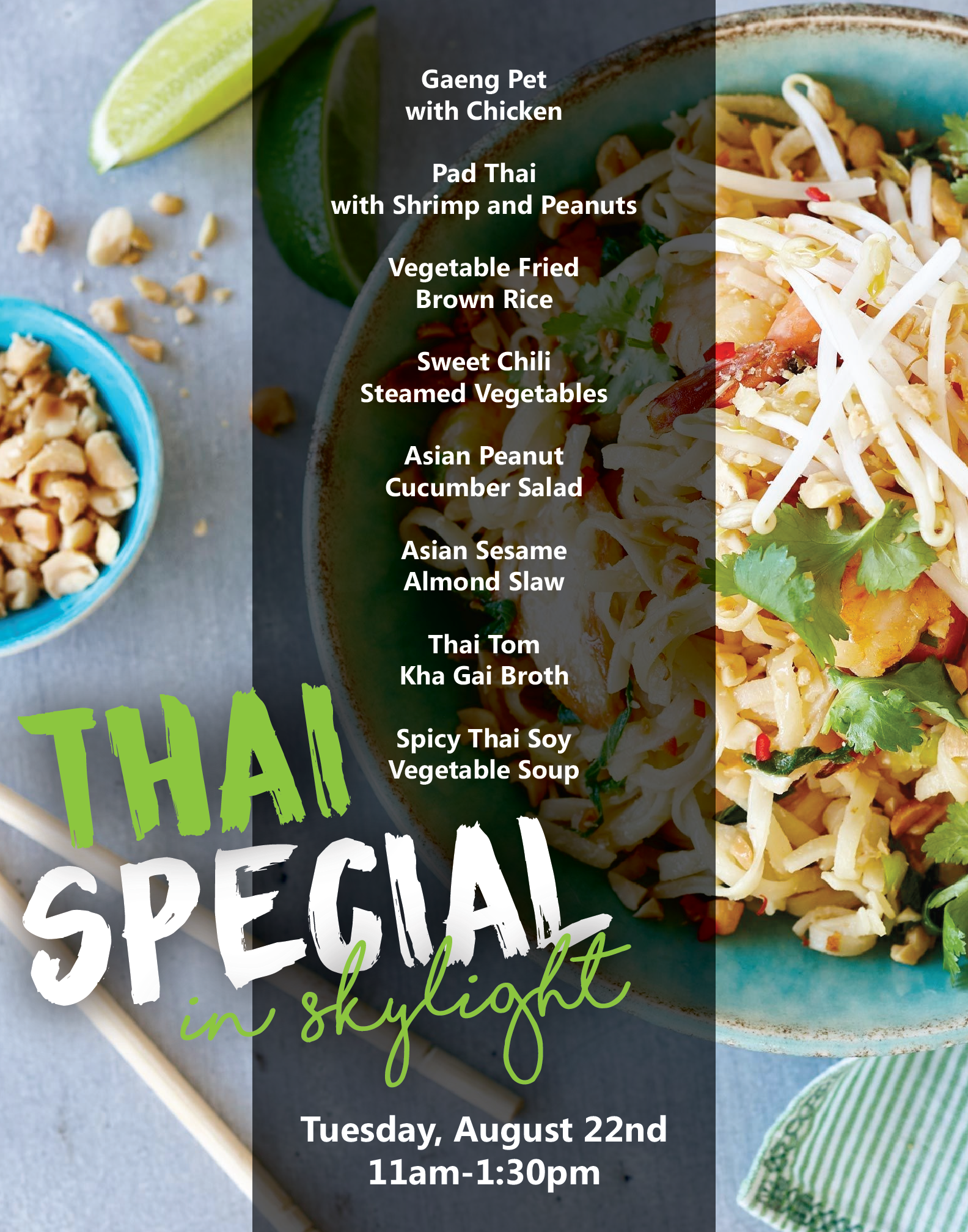 Join us in the Skylight Room today for a Thai Special! We're serving up Thai Tom Kha Broth, Spicy Thai Soy Vegetable Soup, Gaeng Pet with Chicken, Pad Thai, and more!