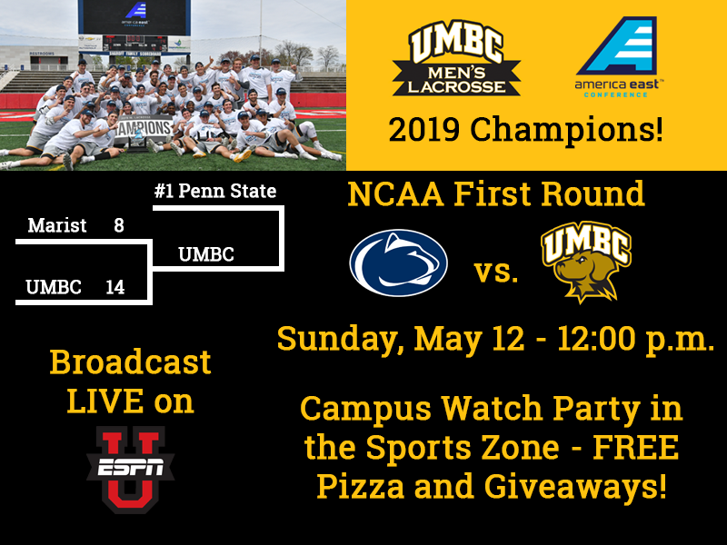 Come out and enjoy free Athletics giveaways and free pizza in the Sports Zone starting at 12pm. The Retrievers' Men's Lacrosse Team takes on Penn State in the NCAA championship tournament. Let's root for another 16 over 1 victory!