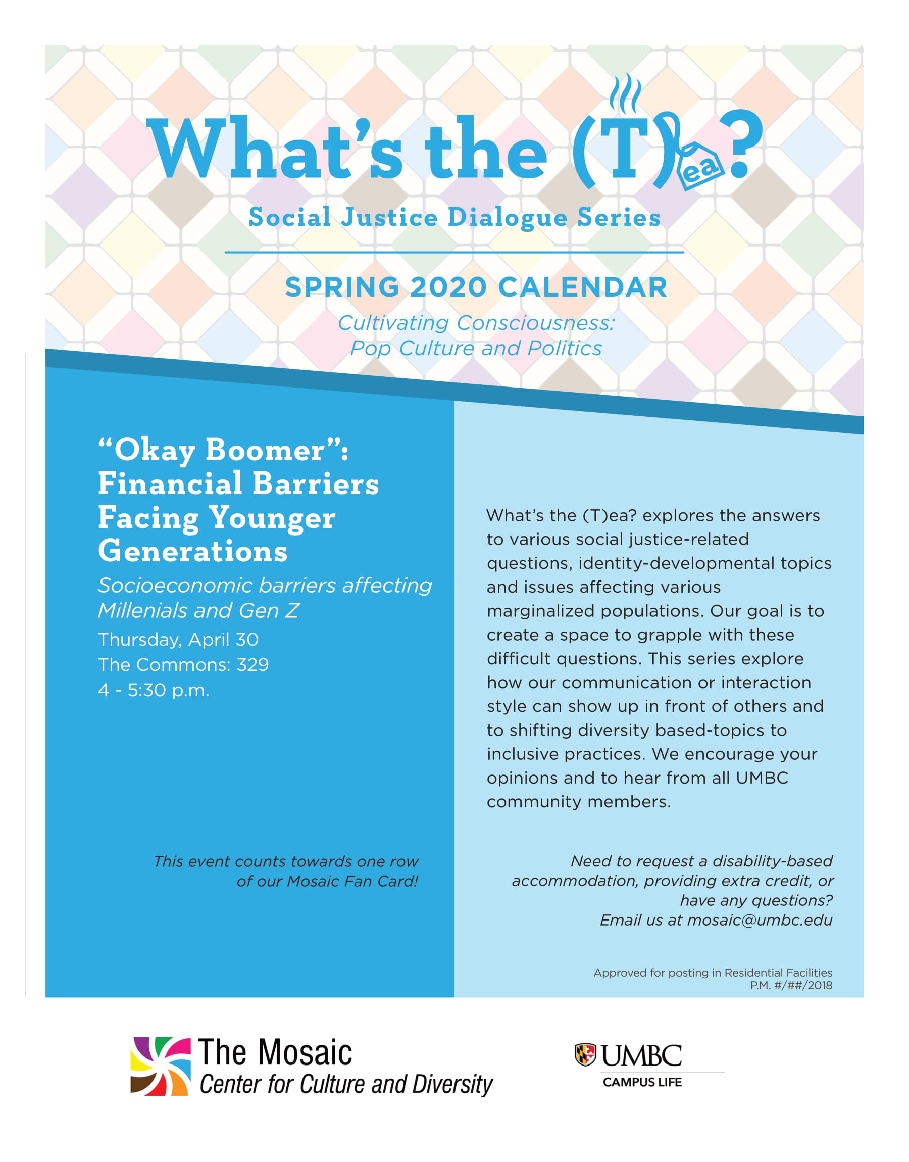 Join us as we explore the factors that have influenced classed-based disparities that have impacted socioeconomic stability in younger generations in the current era. All undergrads, grads, staff, and faculty are encouraged to attend! For any questions, or if you are a faculty or staff member who would like to offer extra credit to your students, please email Campus Life’s Mosaic at mosaic@umbc.edu or Carlos Turcios, Coordinator for Student Diversity and Inclusion at carlos6umbc.edu.