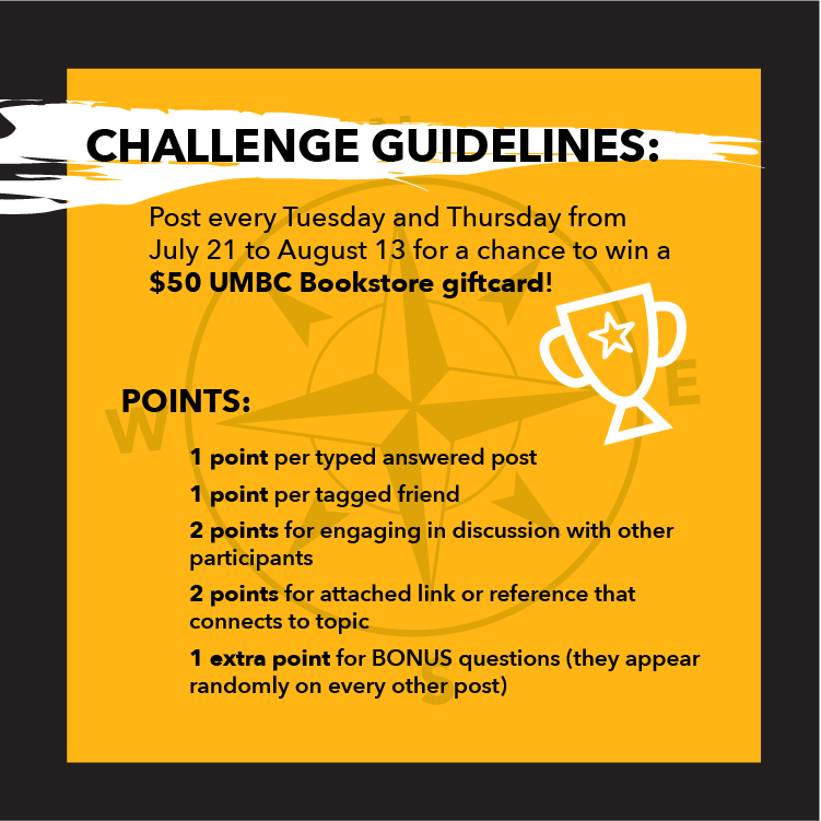 Challenge questions will be posted on the Campus Life Instagram and myUMBC page every Tuesday and Thursday starting July 21st until August 13th. The student who accumulates the most points throughout the challenge will receive a $50 UMBC Bookstore gift card! The Online Leadership Challenge is dedicated to helping students reflect on the intersection of academics, personal experiences & campus involvement to answer the question: What is a leader? And what does leadership look like?